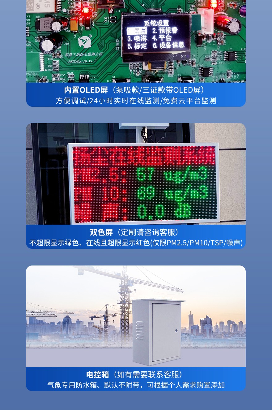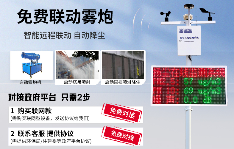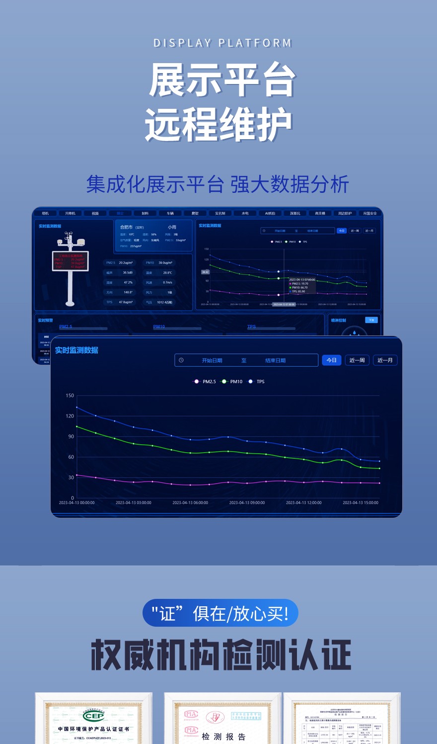 實時采集安裝環(huán)境中PM2.5、PM10、風速、風向、TSP等傳感器數(shù)據(jù),通過處理器計算出實時值、分鐘均值、小時均值、日均值等,發(fā)現(xiàn)揚塵超標時,通過有線或無線方式聯(lián)動霧炮、噴淋等設(shè)備進行降塵作業(yè),達到降低空氣污染的目的。本設(shè)備還可采集噪音、溫度、濕度、風速、風向、氣壓等環(huán)境參數(shù),并能夠通過4G無線網(wǎng)絡(luò)傳輸?shù)竭h程云平臺,實現(xiàn)遠程實時監(jiān)控、各種數(shù)據(jù)分析、統(tǒng)計等功能,實現(xiàn)工地數(shù)字化建設(shè)。